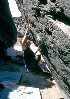 Better known for his routes than his bouldering, Mark Edwards, in addition to the one problem listed here, has bouldered extensively in Sennen’s Black Zawn and below the Coastguard Face (Hayloft Area). Unfortunately any names or grades these problems may have are as yet undocumented. He also bouldered at Carn Brea (whilst studying at Cornwall College in the late nineteen eighties) and, as legend has it, produced a guide.